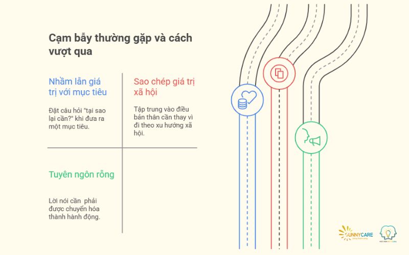 Viết hàng loạt giá trị đẹp đẽ nhưng bỏ quên hành động tương ứng. Giải pháp: Gắn mỗi giá trị với KPI cụ thể và lịch biểu đo lường. Ví dụ: Giá trị “đóng góp xã hội” → 2 giờ/tuần mentoring sinh viên hoặc 5% thu nhập quyên góp quỹ giáo dục.